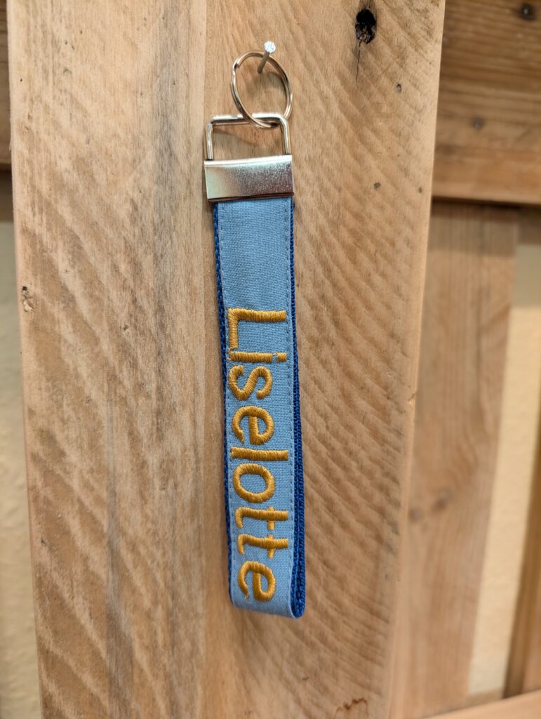 Zudem wird ein farbiger Schlüsselanhänger genäht, auf den in feiner Schrift der Name des Kindes mit einer Stickmaschine gestickt wird. So wird er ganz besonders und unverwechselbar.