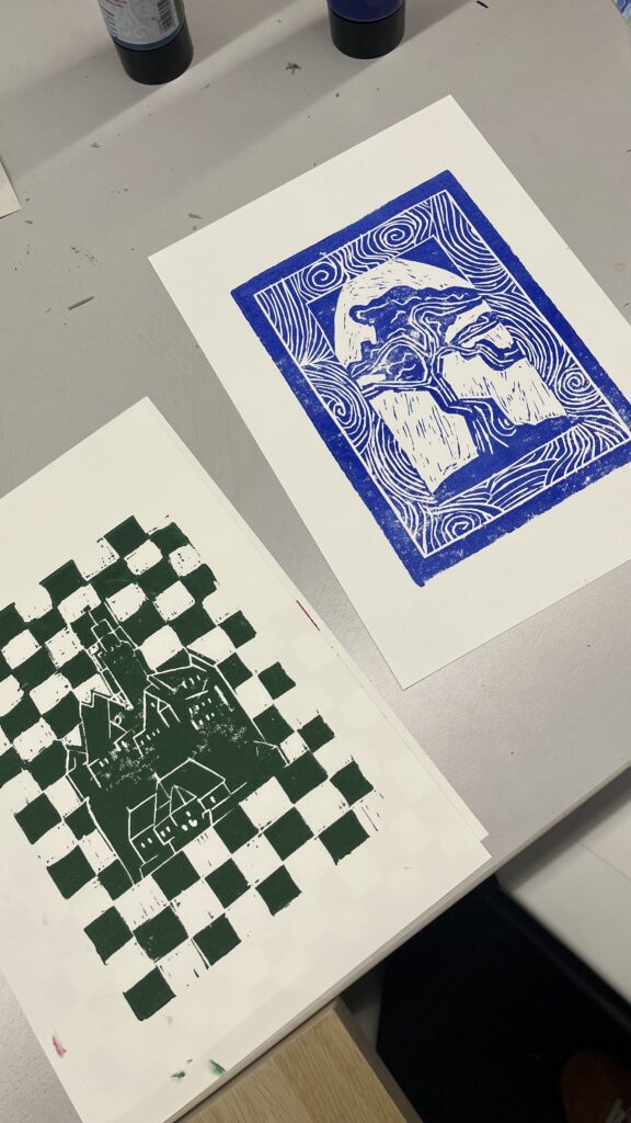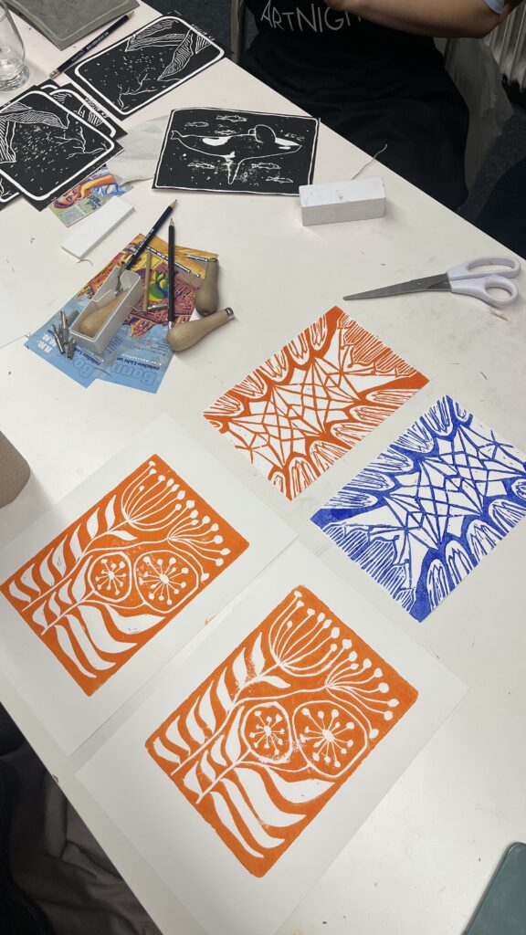Am ersten Tag des Workshops erhalten die Teilnehmenden eine Einführung in den Linolschnitt sowie einen Überblick über den Ablauf. Zunächst wird eine Skizze zur Ideenfindung auf Papier erstellt oder direkt auf eine DIN-A5-Linolplatte übertragen. Nach einer Sicherheitseinweisung beginnt das Schnitzen der Platte. Anschließend folgen Farbauftrag und Druck an der Presse, wobei zwischen Papierformaten (DIN A5 oder A4) gewählt werden kann. Probedrucke ermöglichen Korrekturen und durch Reinigung der Platte können verschiedene Farben ausprobiert werden. Während des gesamten Prozesses werden die Teilnehmenden individuell unterstützt, sodass mehrere Drucke entstehen können.