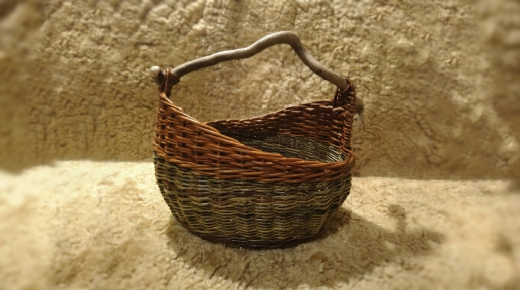 Den ovalen Boden flechten wir in spanischer Technik (welche sehr viel einfacher ist als der hier traditionelle Sternboden), die Seiten enden oben schräg, mit einem vereinfachten Rand, an dessen höchsten Punkten ein passender geschwungener Ast als Henkel angebracht wird. Gerne auch selbst einen schönen, stabilen Ast mitbringen, Durchmesser circa 1,5 cm.