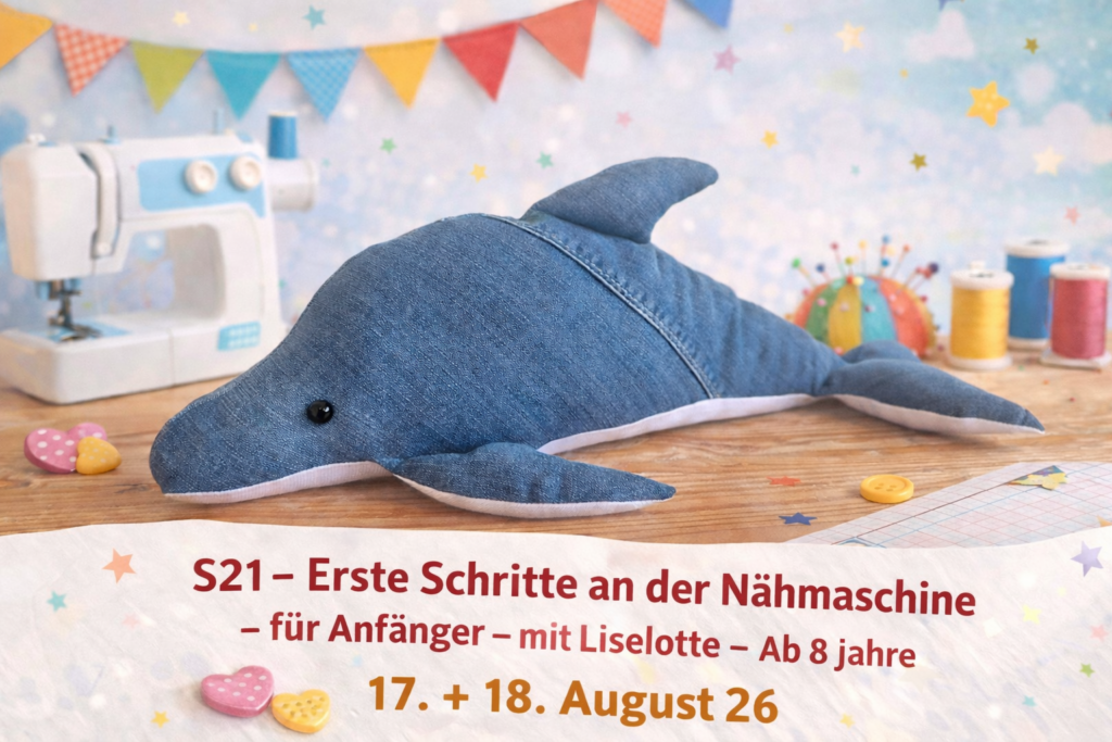 Übung macht nun den Meister. Bleib dran, übe weiter, dann kannst du schon bald große Nähprojekte umsetzen! In diesen zwei Tagen näht ihr ein tolles Delfinkissen.